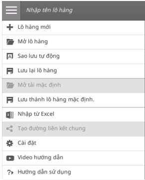 Bằng cách nhấp vào 3 dấu gạch ngang ở bên trái, bạn có thể mở rộng menu liên quan đến lô hàng. Tại đây, bạn có thể chọn: Lưu lô hàng, Mở lô hàng khác và Bắt đầu lô hàng mới.
