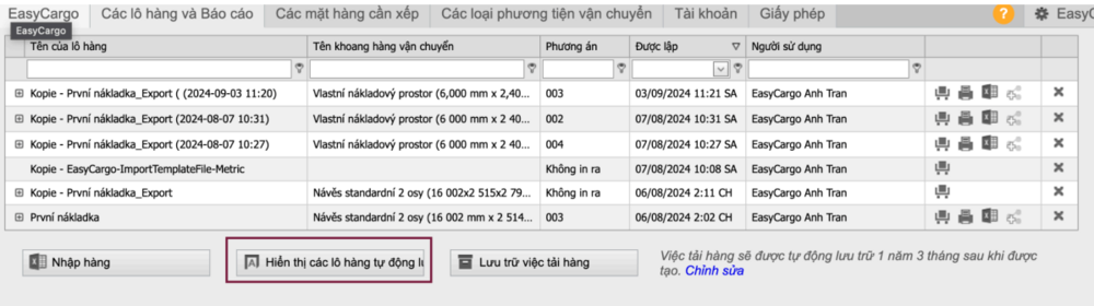 Ứng dụng sẽ tự động lưu dữ liệu nhập lô hàng và kế hoạch xếp hàng hiện tại mỗi 2 phút khi bạn đang hoạt động trong EasyCargo. Người dùng có thể xem lại các bản sao lưu này trên thanh công cụ Các lô hàng và Báo cáo bằng cách nhấn vào nút Hiển thị các lô hàng lưu tự động. EasyCargo sẽ tự động lưu 10 bản lô hàng gần đây nhất. Các bản sao lưu tự động chỉ hiển thị và truy cập được bởi bạn, trong khi các lô hàng được lưu thủ công sẽ chia sẻ cho các Quản trị viên khác trong tài khoản của bạn. Bạn có thể tìm thấy bản sao lưu tự động trong tab Các Lô hàng và Báo cáo: