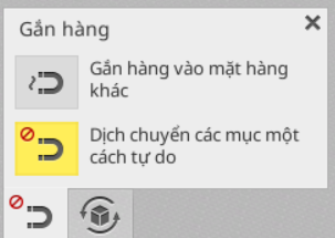 Nút này cho phép bạn bật tính năng tự động xoay các mặt thùng trong chế độ xếp thủ công. Khi nhấp vào nút, bạn có thể chọn có tự động xoay món hàng khi đặt vào khoang hàng hay không. Tính năng này đặc biệt hữu ích khi di chuyển các món hàng từ khối này sang khối khác.