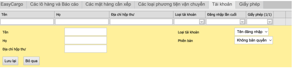 Mỗi người dùng có thể thay đổi thông tin của mình bằng cách nhấn vào tên của mình ở góc trên bên phải màn hình. Chỉ người dùng có vai trò Quản trị viên mới có thể thay đổi địa chỉ email. Quản trị viên cũng có thể xóa các Người dùng khác hoặc các Quản trị viên khác. Để sử dụng EasyCargo, người dùng cần được cấp giấy phép. Giấy phép này còn có thể được chia sẻ giữa các người dùng, nhưng giấy phép này không thể sử dụng đồng thời. Để chuyển giấy phép cho người dùng khác, người dùng cần phải chuyển nó trong tab Tài khoản. Để hai người dùng có thể làm việc cùng một lúc, phải có hai giấy phép.