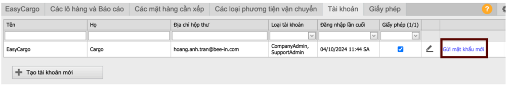 Người dùng có vai trò Quản trị viên có thể cấp phép hoặc quản lý các người dùng khác. Số lượng Quản trị viên là không giới hạn. Những người dùng này cũng có quyền truy cập vào các tab Tài khoản, Giấy phép và Các loại phương tiện vận chuyển, trong khi Người dùng bình thường không thấy các tab này. Người dùng bình thường chỉ có quyền truy cập vào các tab EasyCargo và Các lô hàng và Báo cáo. Họ có thể tạo và truy cập các lô hàng đã lưu, nhưng không thể quản lý tab Các loại phương tiện vận chuyển, tài khoản hoặc giấy phép.
