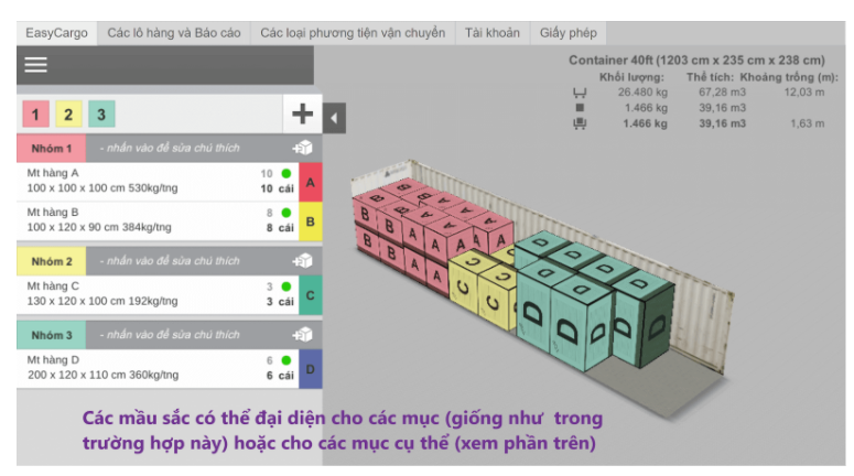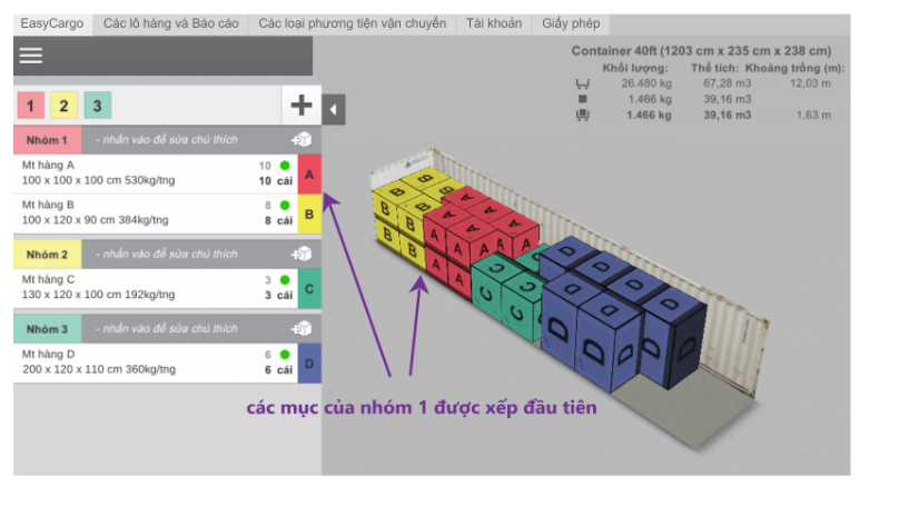 Các nhóm (Ưu tiên) cho phép bạn chỉ dionhj các mục theo thứ tự được xếp trong khoang hàng. Các mục của nhóm 1 sẽ được xếp đầu tiên, sau đó sẽ đến nhóm 2 và tiesp đó sẽ là nhóm 3, …Với phương pháp này thì bạn có thể tác động đến phương án tải hàng, ví dụ như phụ thuộc vào trình tự xe camion nào sẽ đến điểm nào.